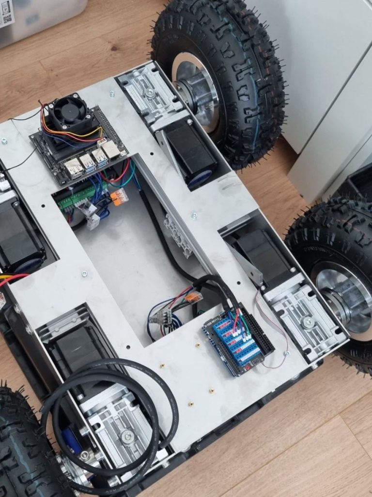 The next steps are as follows: change the power supply from 24V to 48V, as the motors reach their specified torque at 48V. Conversion to more powerful motors and a different gear ratio. Configuration and installation of ROS2 on the Nvidia Jetson. Setting up the Intelrealsense RGBD camera.